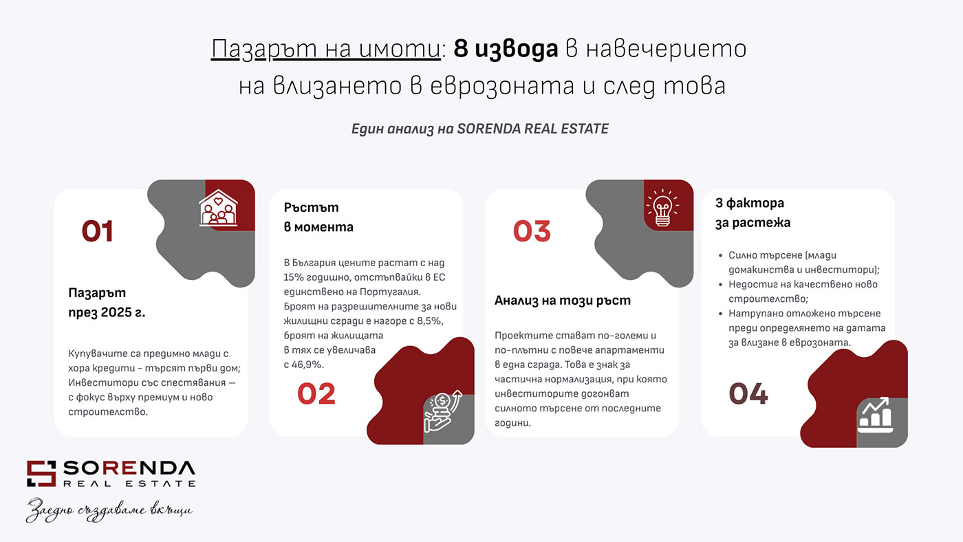 SORENDA Real Estate обобщава точката, в която се намираме, така: „висока скорост на пазара не означава безкраен ускорителен режим“. Влизането в еврозоната не е стартова линия, а смяна на предавка. След 1 януари поведението на участниците се променя — и именно то ще определи новия цикъл.